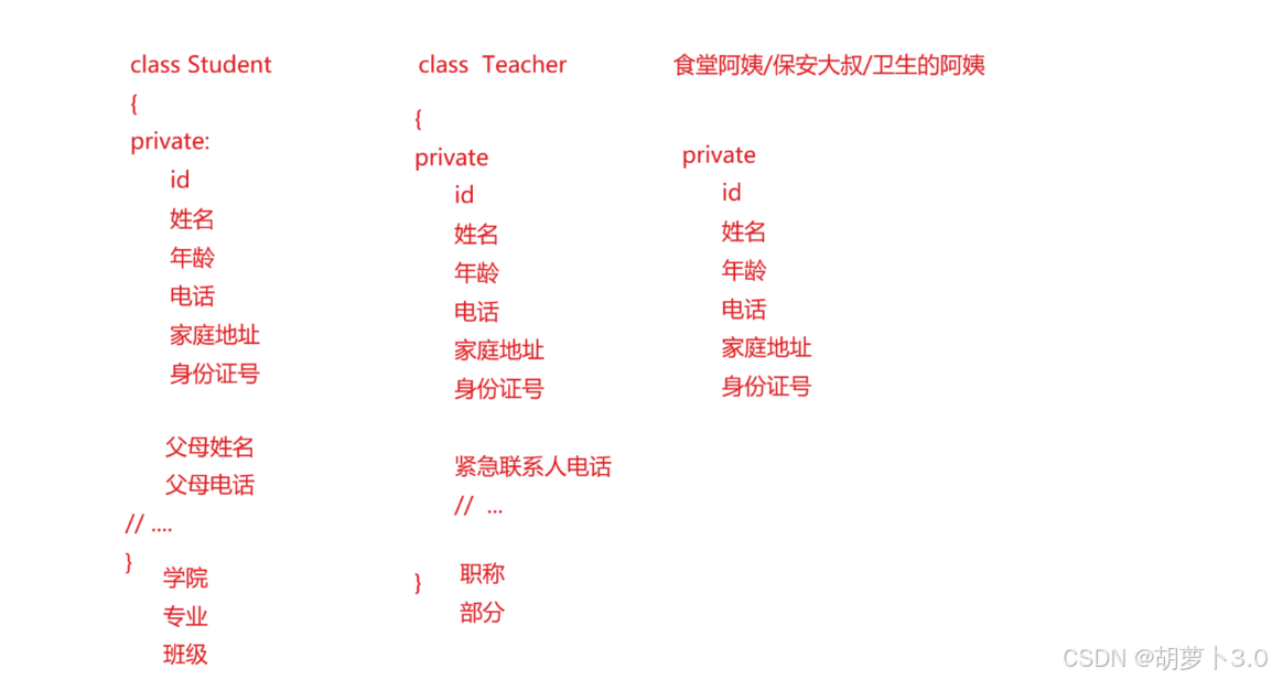 那如果我们在写这三个类的时候,在每个类中都写上这些重复的成员,是不是显得有点冗余,对于空间来说是不是有点浪费!!!