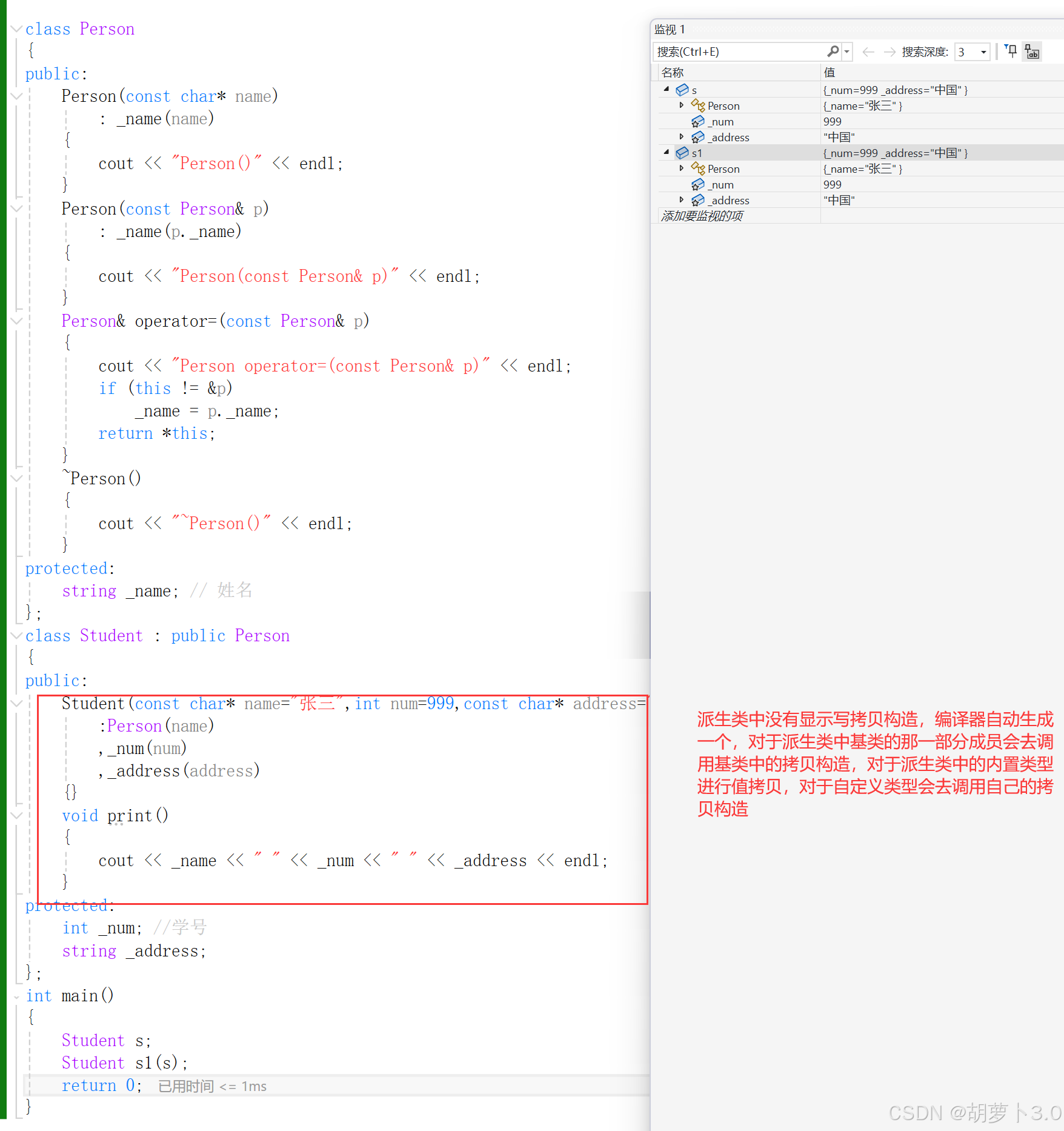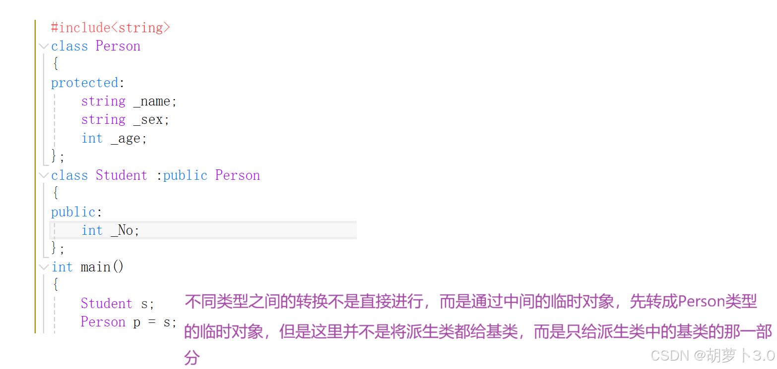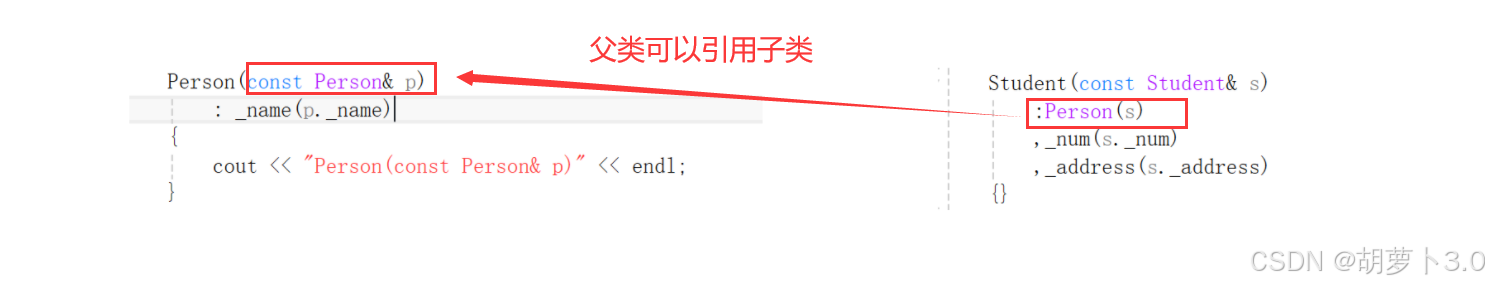 //派⽣类对象可以赋值给基类的对象是通过调⽤后⾯会讲解的基类的拷⻉构造完成的