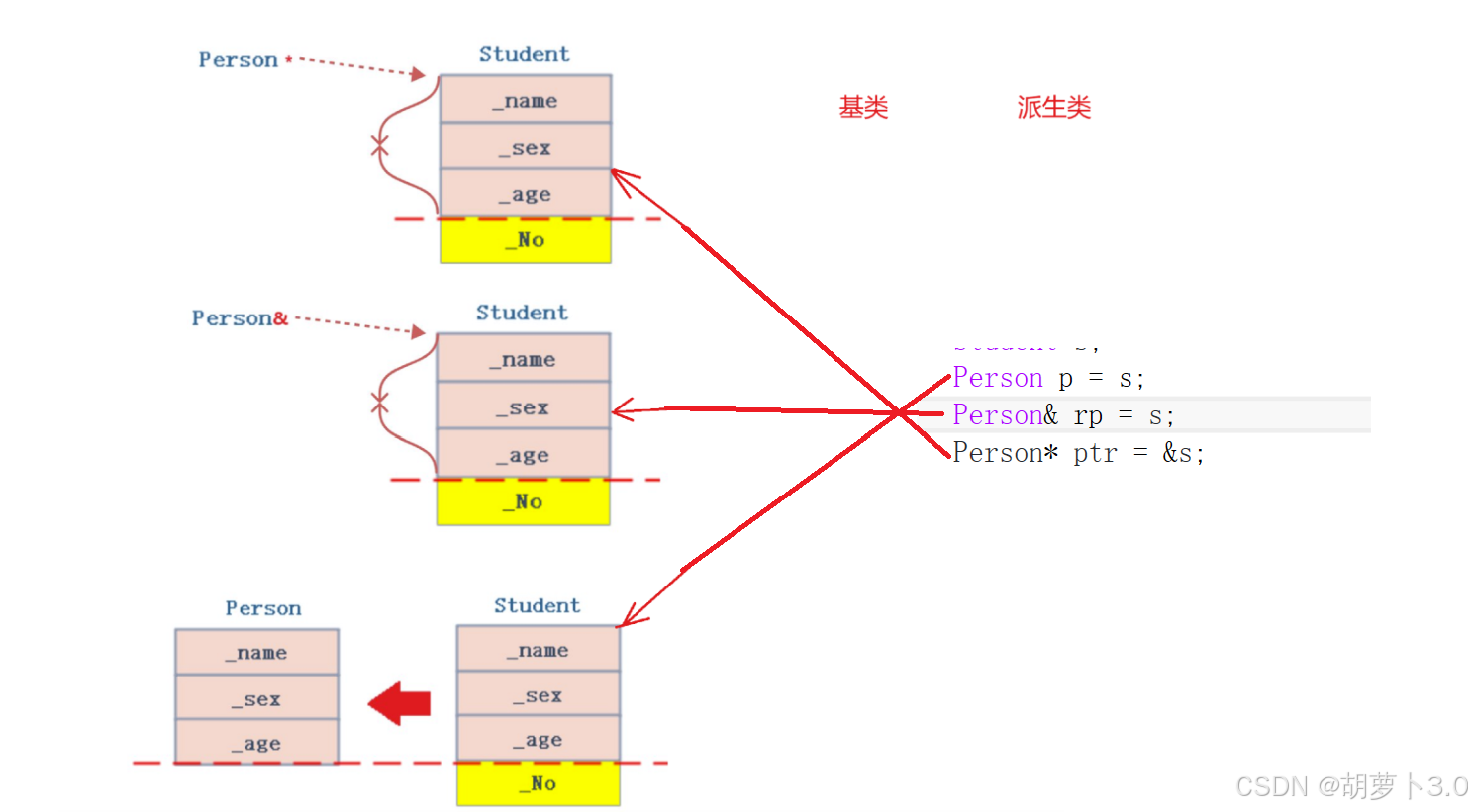 这里有个形象的说法叫切片或者切割。寓意把派生类中基类那部分切出来,基类指针或引用指向的是派生类中切出来的基类那部分。