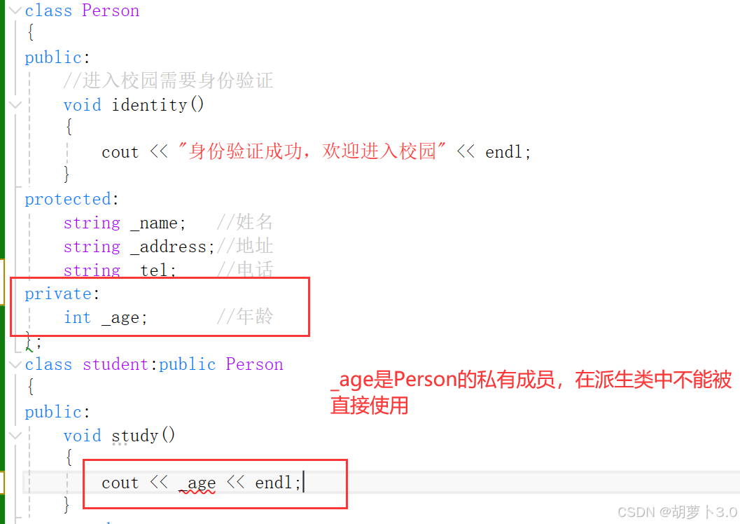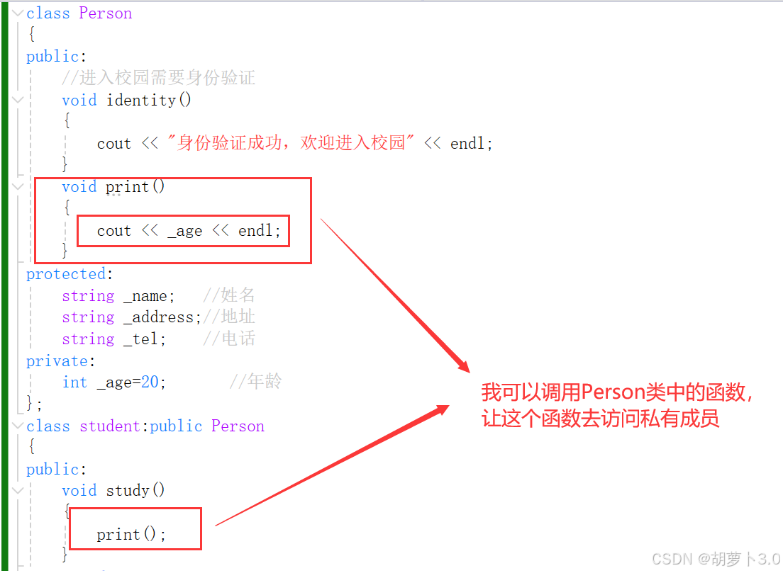 什么叫做在派生类中不可见? 基类的所有成员都会继承下来,但是基类中的private成员不能直接被使用。 (这基类的私有成员就好比如爸爸的私房钱,如果你直接跟你爸说“把你的私房钱给点,我要去下馆子”,你爸爸肯定不会给你,但是我们可以间接的说“我在你的车上发现了鱼竿,这个鱼竿是怎么来的;或者我好像听你们公司的啥叔叔说好像发了奖金”,这时候你爸爸肯定会说:“走,现在就去下馆子”)。 基类的私有成员在派生类中不可见,语法上是指不能直接被使用,但是可以间接使用,可以调用父类中的一个方法,这个方法中可以访问基类的私有成员