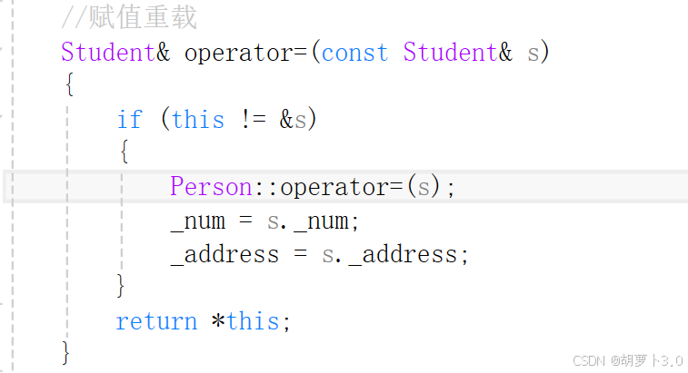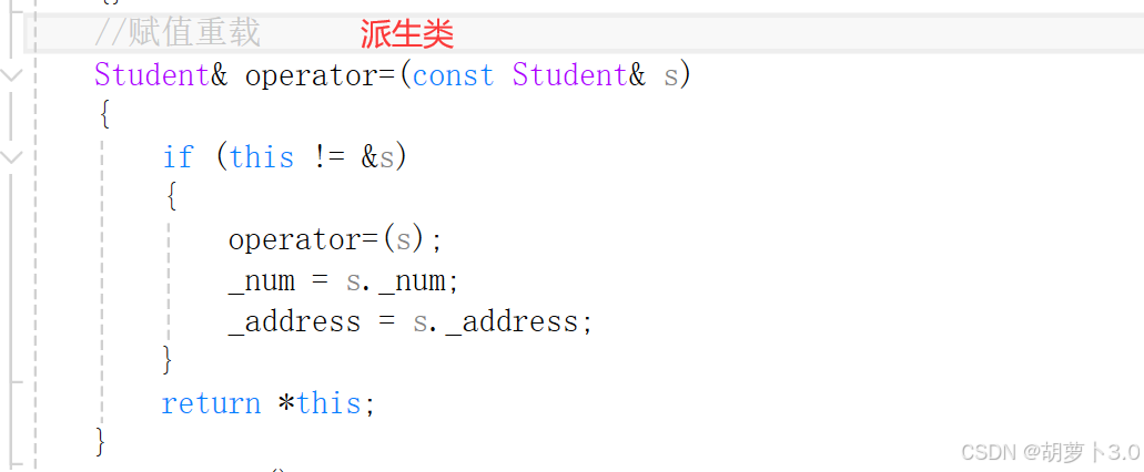 这是因为:基类中有operator=,派生类中也有operator=,这就构成隐藏,如果这么写,会导致无法调用到基类中的赋值重载,所以我们要显示调用基类中赋值重载