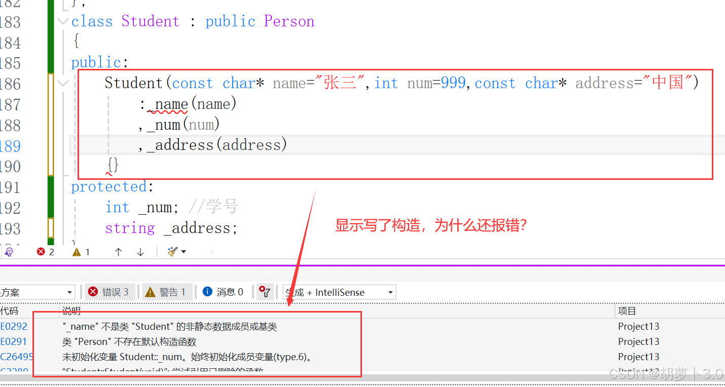 在派生类中,我们不写构造,编译器自动生成的构造函数对于基类中的那一部分成员必须调用基类中的构造函数去初始化基类的那一部分成员,如果基类中没有默认的构造函数,则必须在派生类构造函数的初始化列表中显示调用;