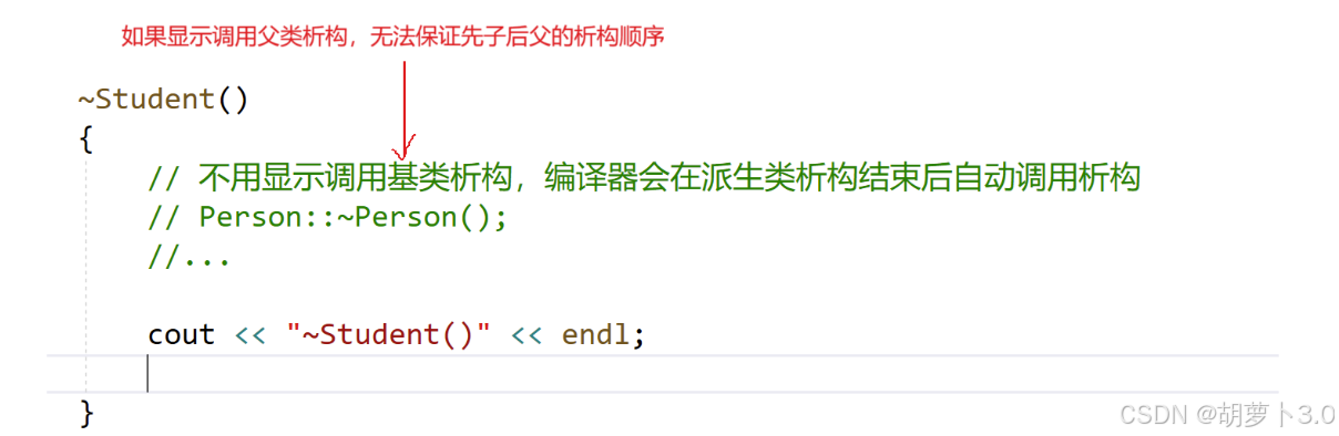 总结:如果在派生类中显示写析构,不用在析构里面显示写基类的析构,在派生类的析构结束后,编译器会自动调用基类的析构