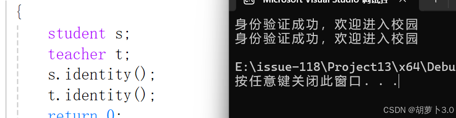 下面我们看到没有继承之前我们设计了两个类Student和Teacher,Student和Teacher都有姓名/地址电话/年龄等成员变量,都有identity身份认证的成员函数,设计到两个类里面就是冗余的。当然他们也有一些不同的成员变量和函数,比如老师独有成员变量是职称,学生的独有成员变量是学号;学生的独有成员函数是学习,老师的独有成员函数是授课——