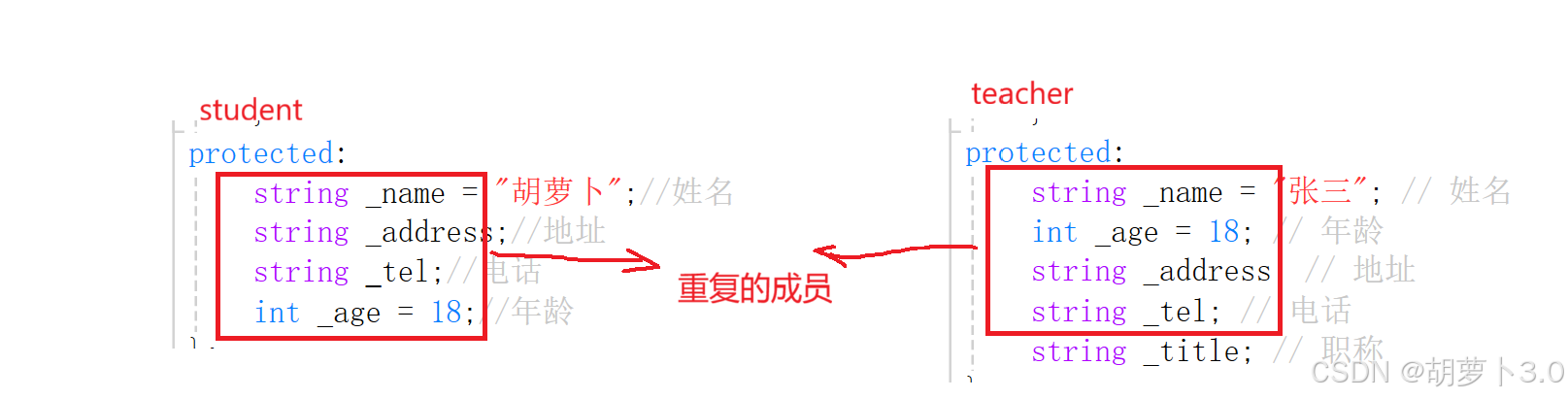 然后,student 和 teacher 这两个类就可以都继承person这个类,就可以复用这些成员,就不需要重复定义了,省去了很多麻烦