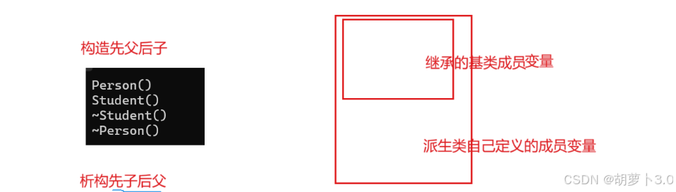 如果是先父后子,子类可以访问父类中的成员,若先析构父类的成员,子类可能会指向野指针,若此时对野指针进行接引用,会有问题,所以析构要先子后父