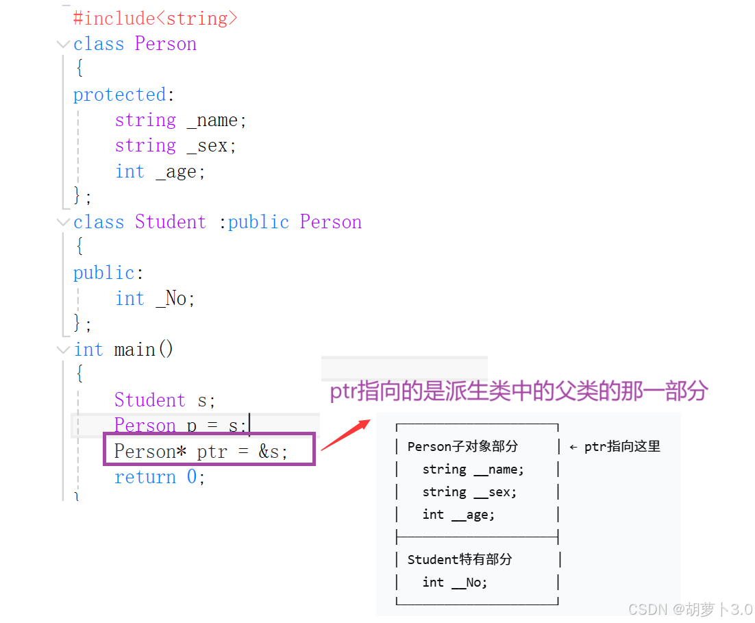 下面我们看到Person类叫做基类(也称作父类)。Student类叫做派生类(也称为子类)。(因为翻译的原因,所以可以叫做基类/派生类,也叫做父类/子类)