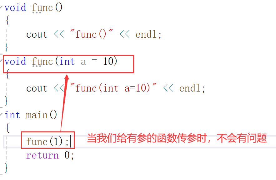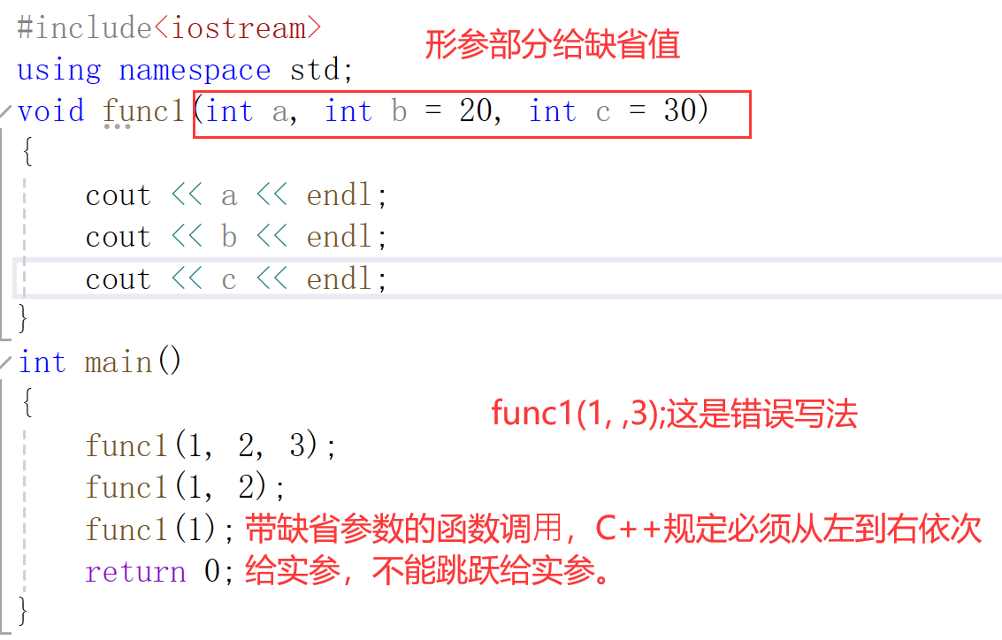 重点:如果在调用函数时,给函数传参数,就用传的参数作为实参;如果不传参数,缺省值作为实参