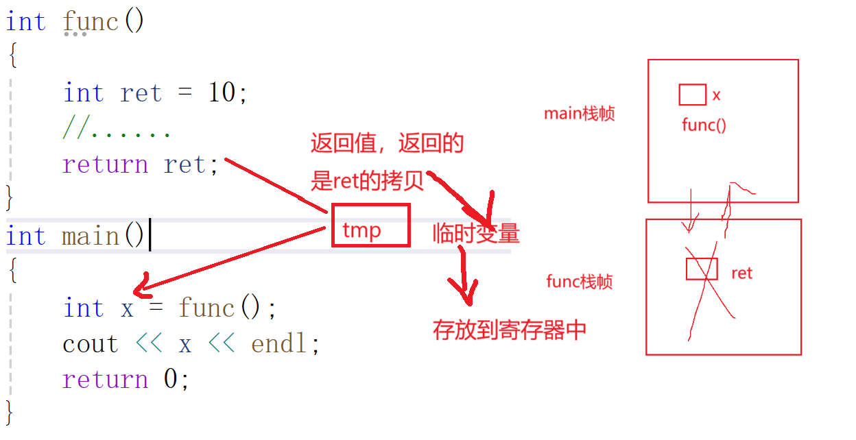上图中写到tmp(假设的)可能是10,也可能是随机值,这要看func这个函数桟帧是否完全销毁(后面会说到,这里先放着)。