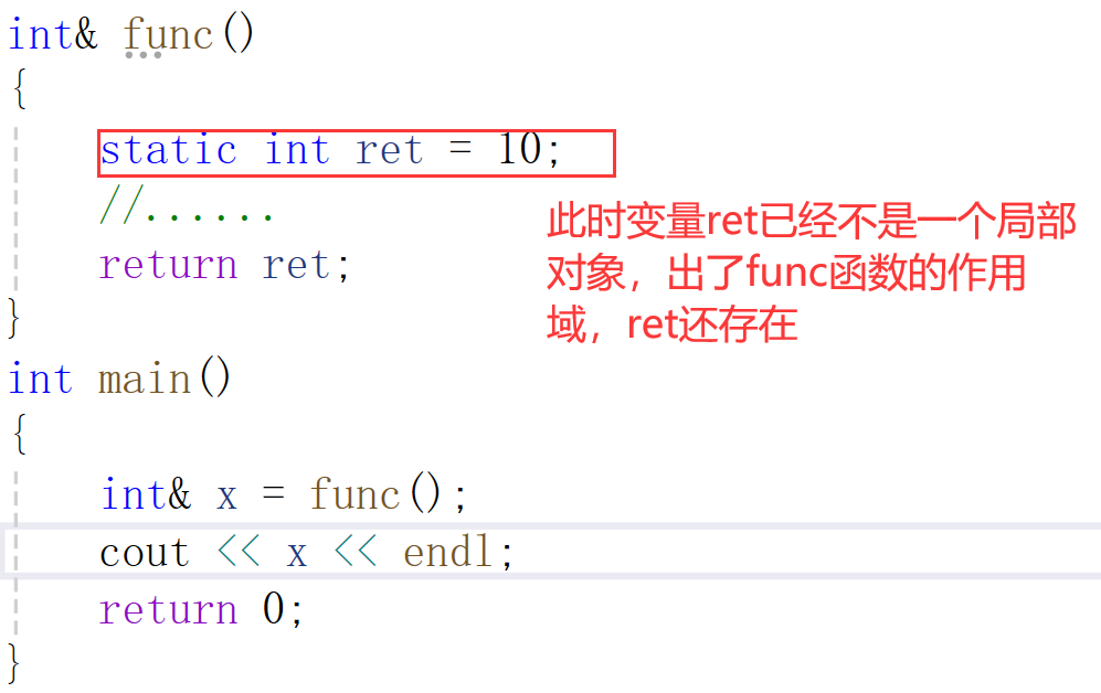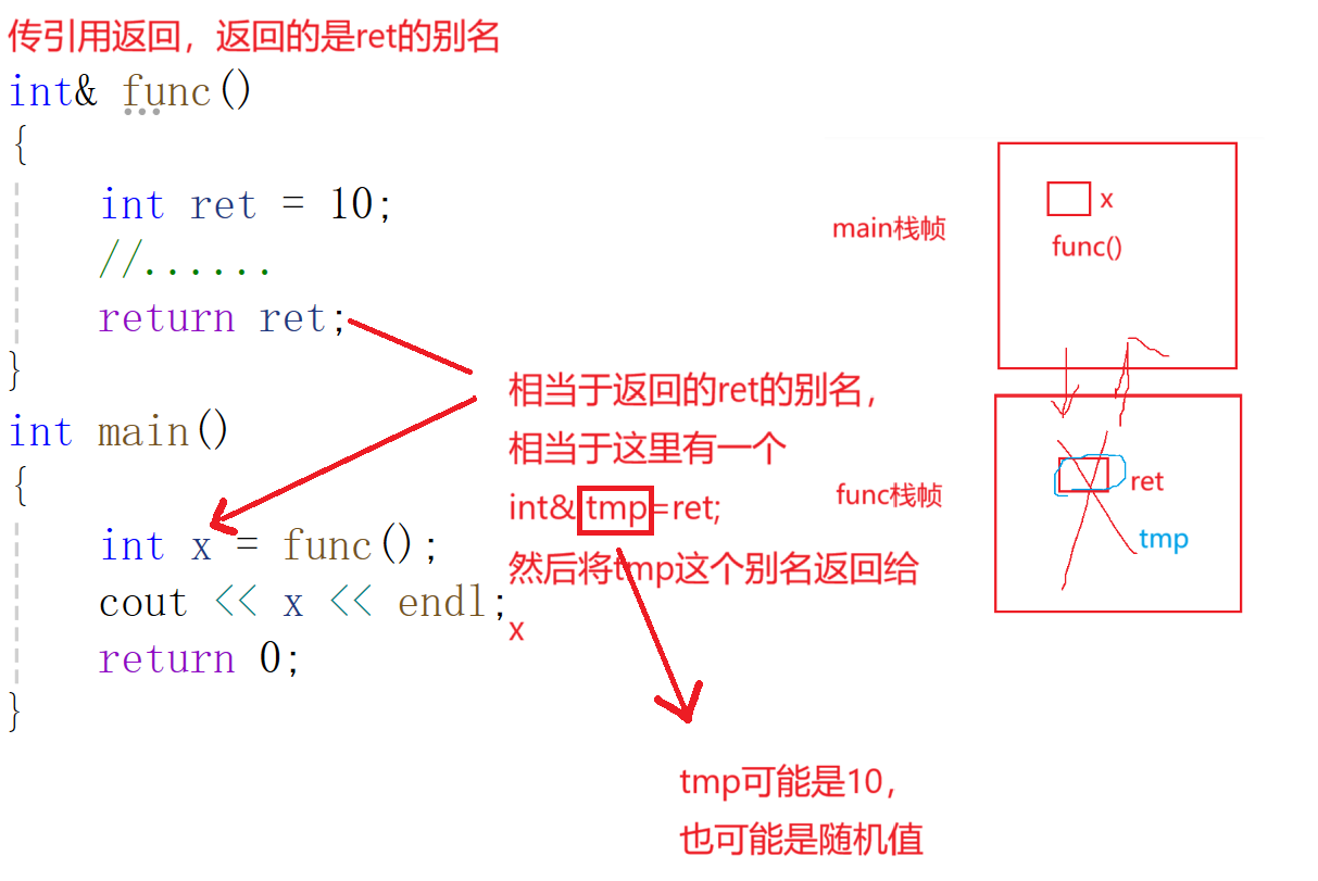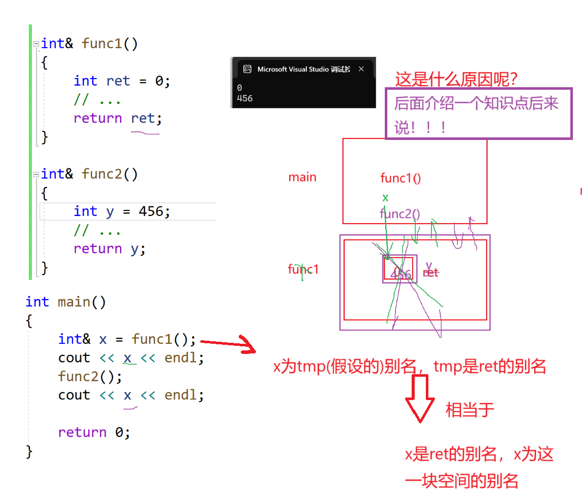 这是因为x是ret的别名,在底层上x存的是func1()函数中的ret的地址,func1()的函数桟帧销毁后,内存数据不会立即清零,空间并不是没有了,而是空间返还给操作系统,但是x在底层上存的是地址,所以可以通过x找到ret,func2()函数跟func1()函数所使用的空间正好相等,操作系统将func1()返回的空间又给了func2() ,第二次 cout << x:x 仍然指向原来的位置,但该位置现在存储的是 y 的值(456),所以可能输出 456。