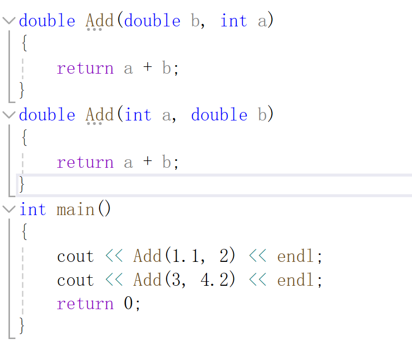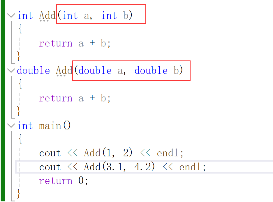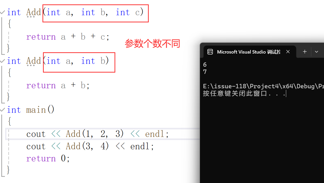 C++支持在同一作用域中出现同名函数,但是要求这些同名函数的形参不同,可以是参数个数不同、参数类型不同、参数类型顺序不同。这样C++函数调用就表现出了多态行为,使用更灵活。但是C语言是不支持同⼀作用域中出现同名函数的