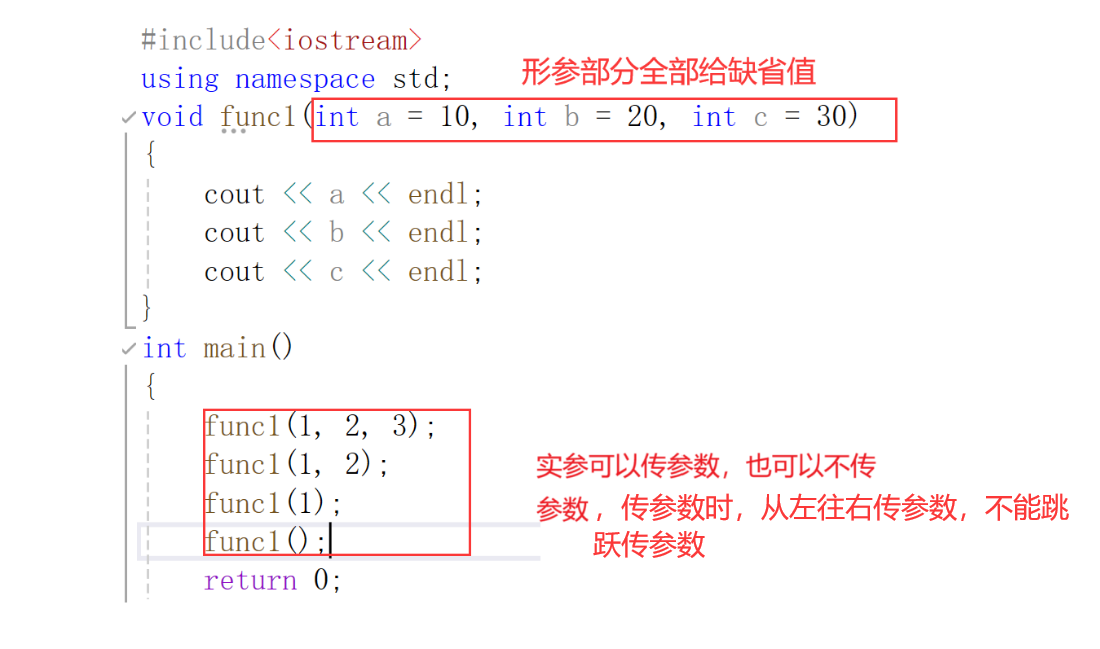 缺省参数是声明或定义函数时为函数的参数指定⼀个缺省值(在定义函数时给形参赋值)。在调用该函数时,如果没有指定实参则采用该形参的缺省值,否则使用指定的实参,缺省参数分为全缺省和半缺省参数。(有些地方把缺省参数也叫默认参数)