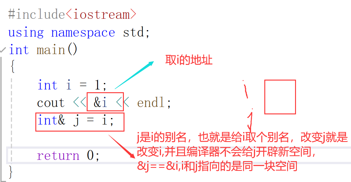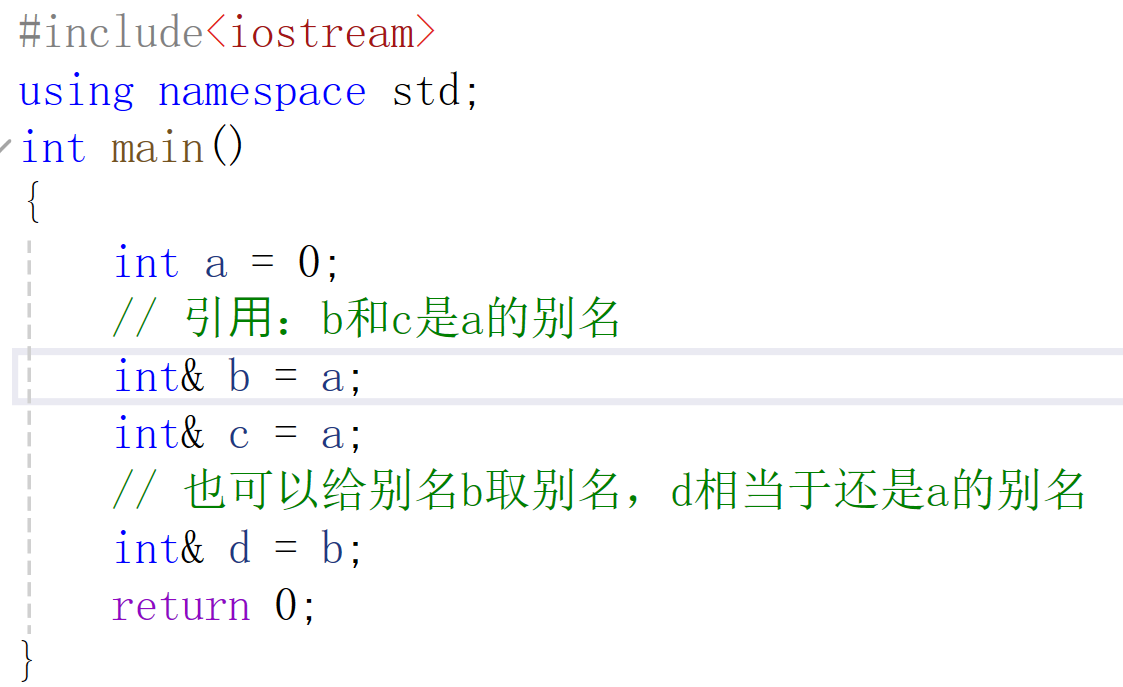 引用就相当于是取别名: 我们给已存的变量取个别名,编译器不会给别名开辟新的空间,变量和别名共同使用同一块空间。我们还可以给别名取别名,但是还是原来的那一块空间,改变别名就是改变变量。 注意:在语法层上编译器不会给别名开辟新的空间