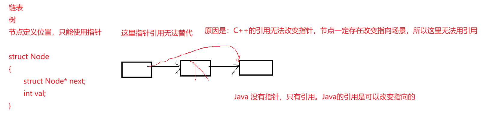 在上面中,我们说过引用是替代绝大多数的指针场景,那么那一小部分无法替代的场景是什么呢? 那就是链表,树等需要节点定义位置的只能使用指针,无法用引用替代 原因: C++中的引用无法改变指向