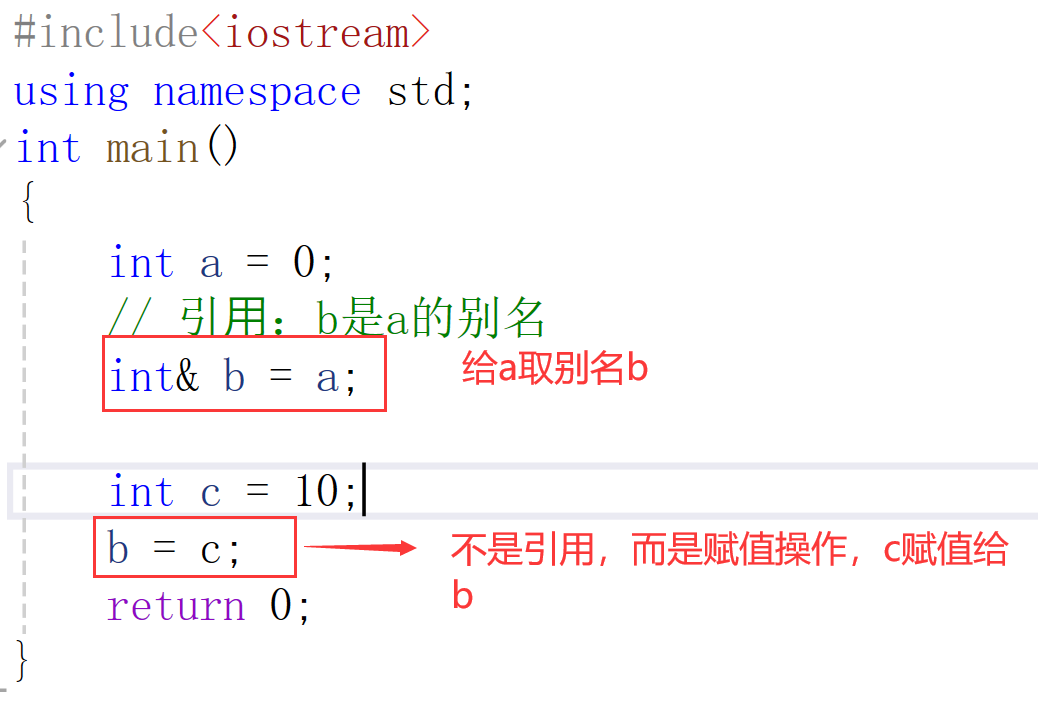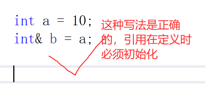引用不是新定义⼀个变量,而是给已存在变量取了⼀个别名,编译器不会为引用变量开辟内存空间,它和它引用的变量共用同⼀块内存空间。