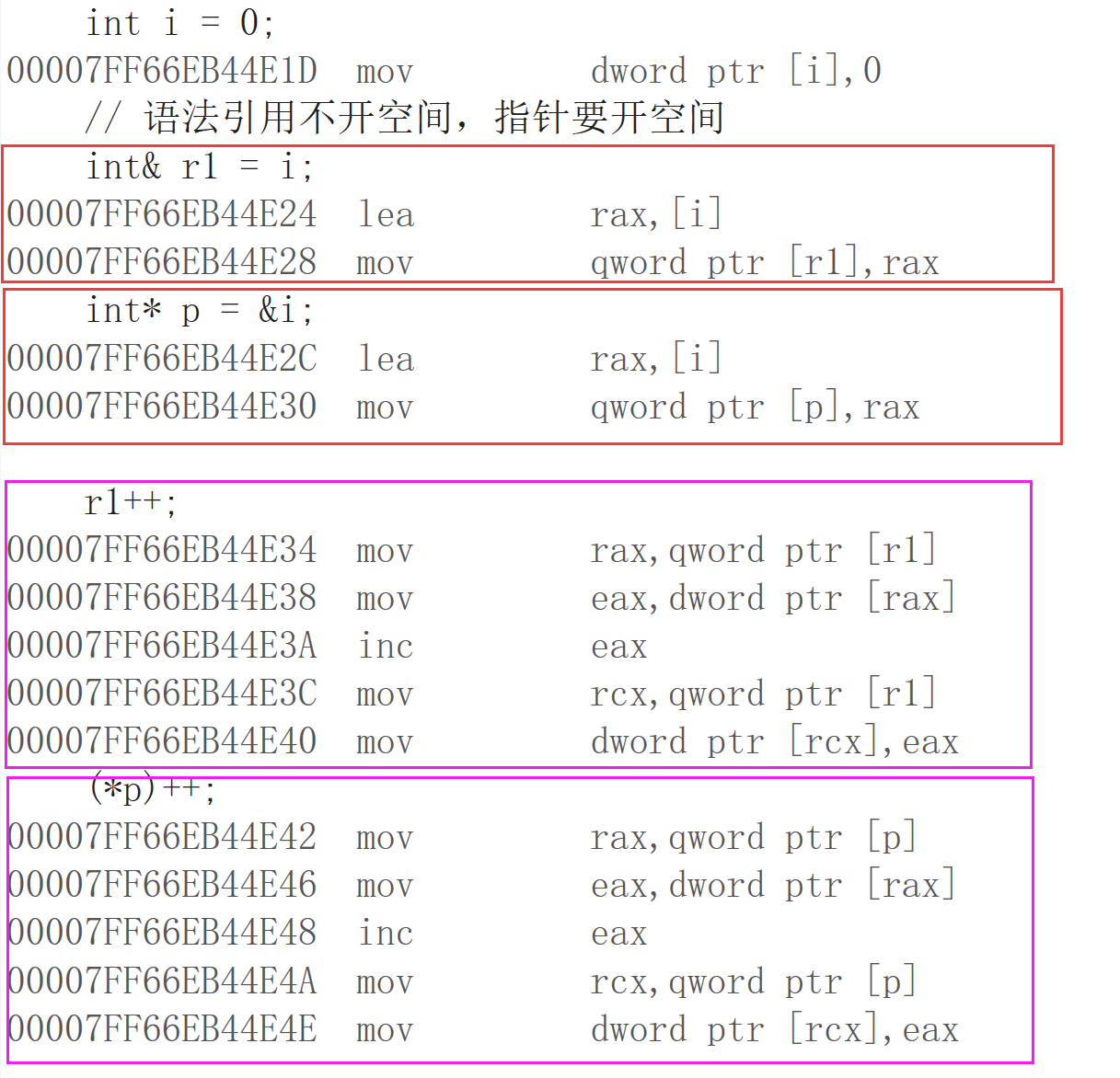 我们将上面的代码转换成汇编代码,我们可以清晰的发现两种颜色的方框内的指令一模一样,根据上面我们可以得出一个结论: