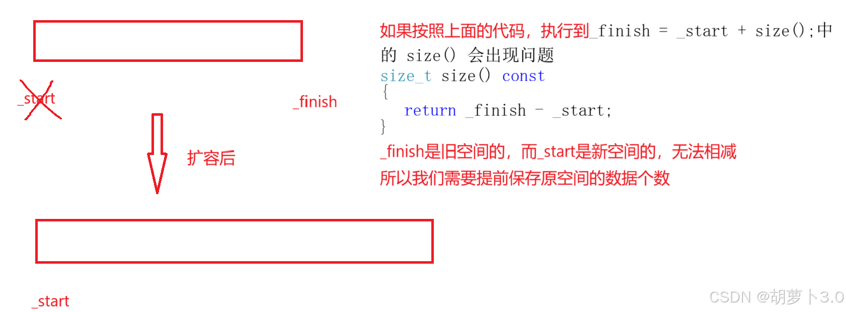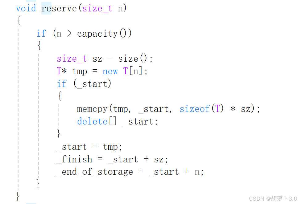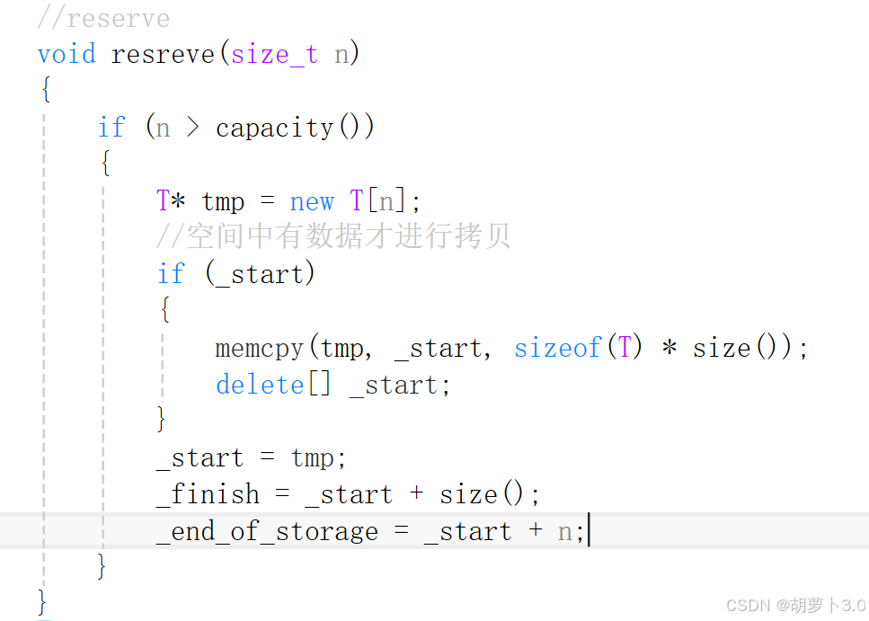 }这里有一个问题,我们知道拷贝构造是用一个已经创建的对象去初始化另一个要创建的对象,但是这里的reserve中要使用这个要创建的对象,但是这个要创建的对象中的_start ,_finish _end_of_storage没有初始化,会有一些问题