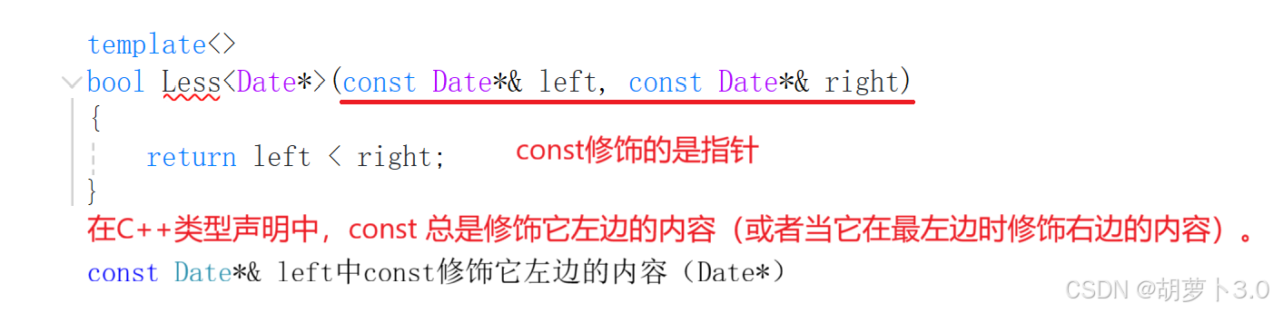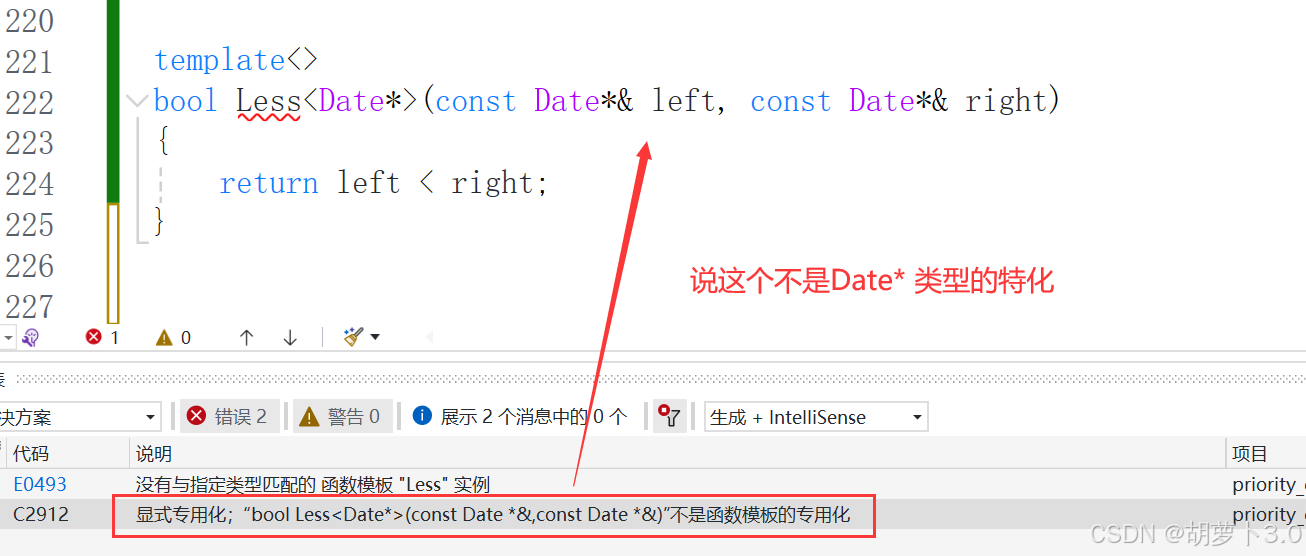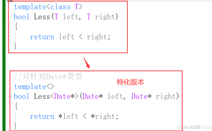 但是我们期望的不是按指针来比较,而是按照指针指向的内容来比较,那此时我们就可以实现一个函数模板的特化(对原版本的特殊化处理)