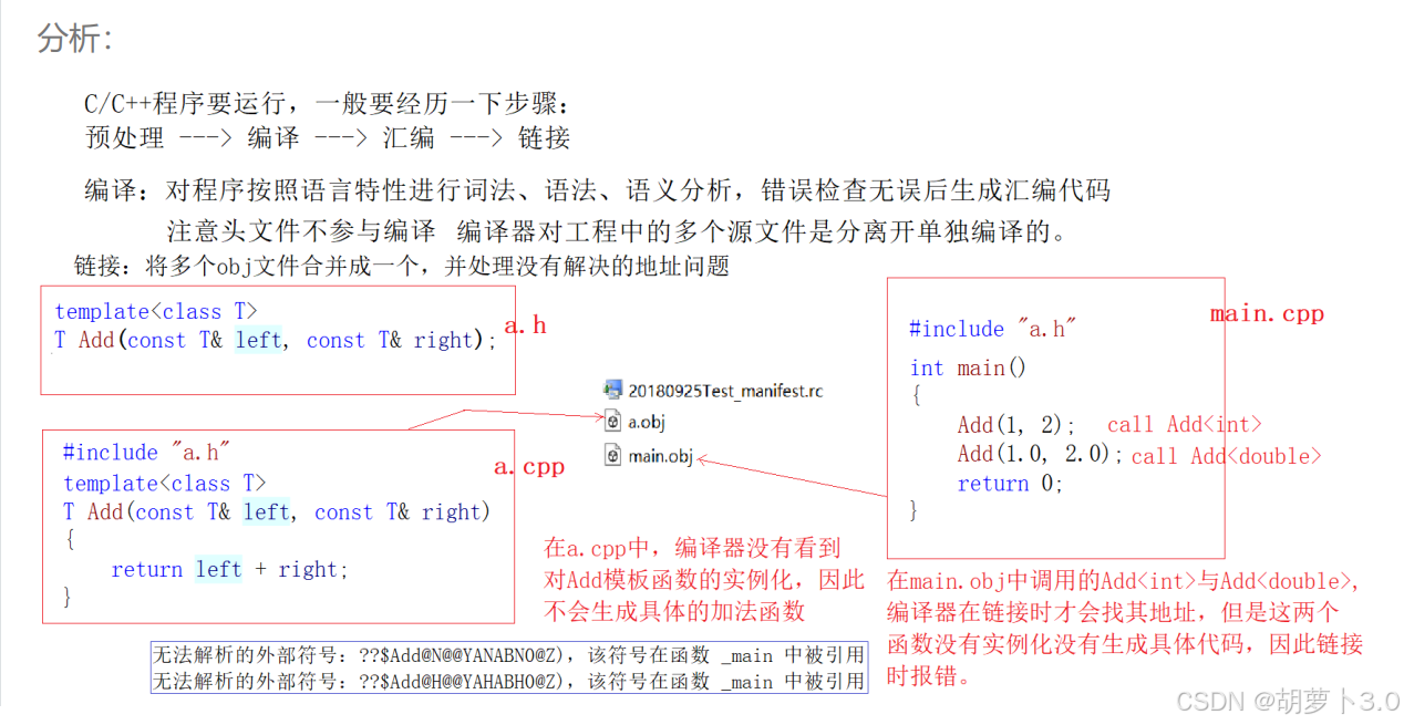 在这块内容里,我们就要来谈谈为什么说模板不能声明和定义分离到两个文件中(比如:一个在.cpp中,一个在.h中)