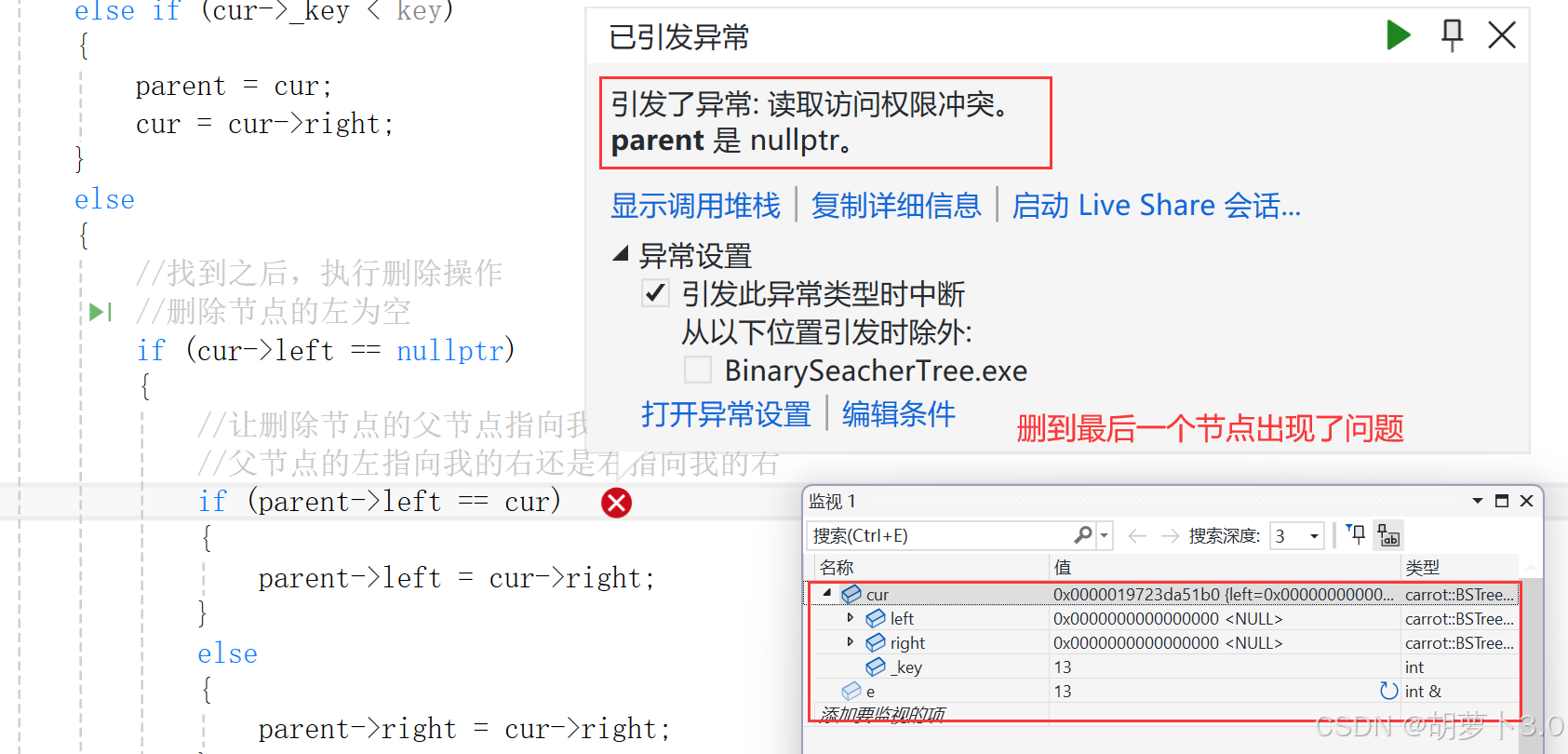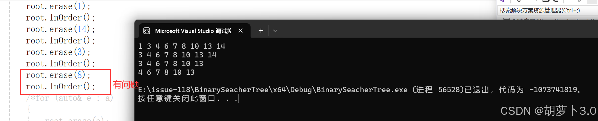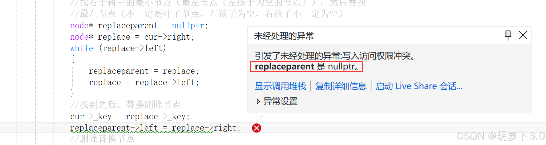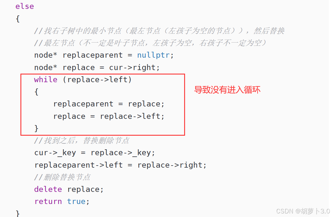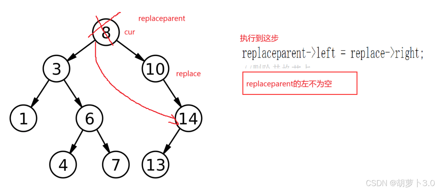 //此时replaceparent->left = replace->right有问题,replaceparent->left有数据