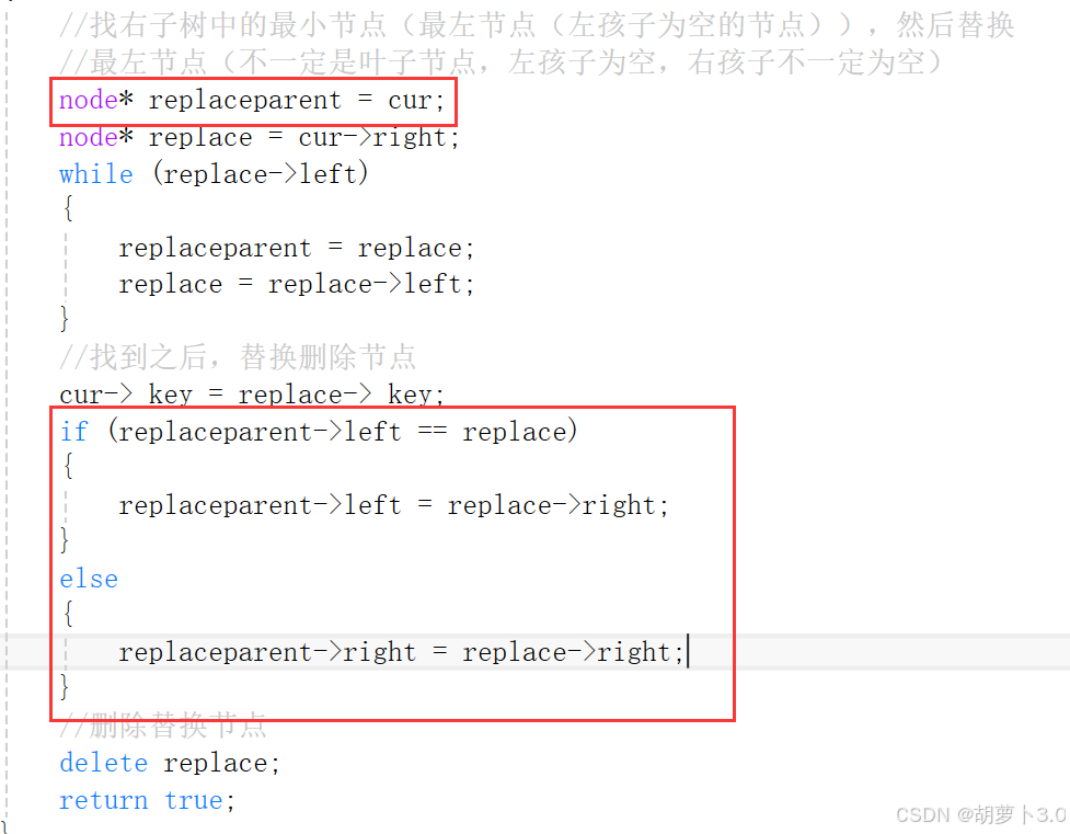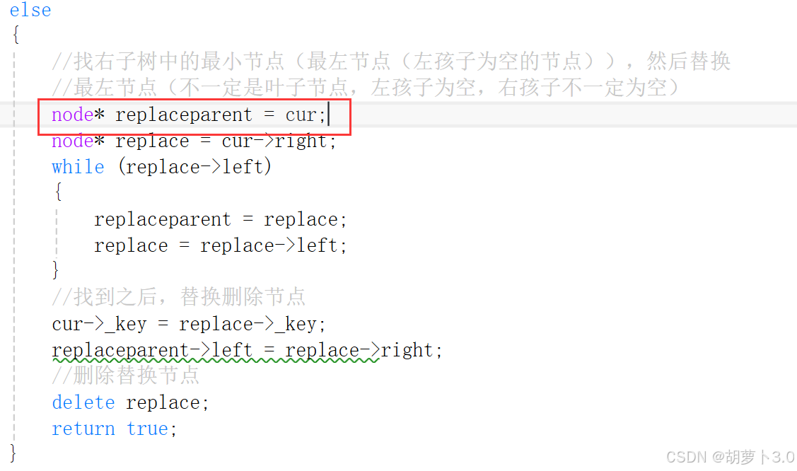 所以我们应该让node* replaceparent = cur(cur为根结点)