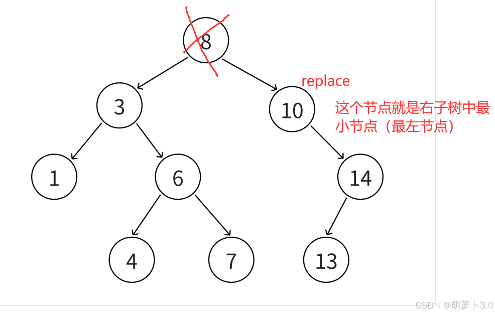 //找删除节点的右子树中的最小节点(最左节点(左孩子为空的节点)),然后替换
