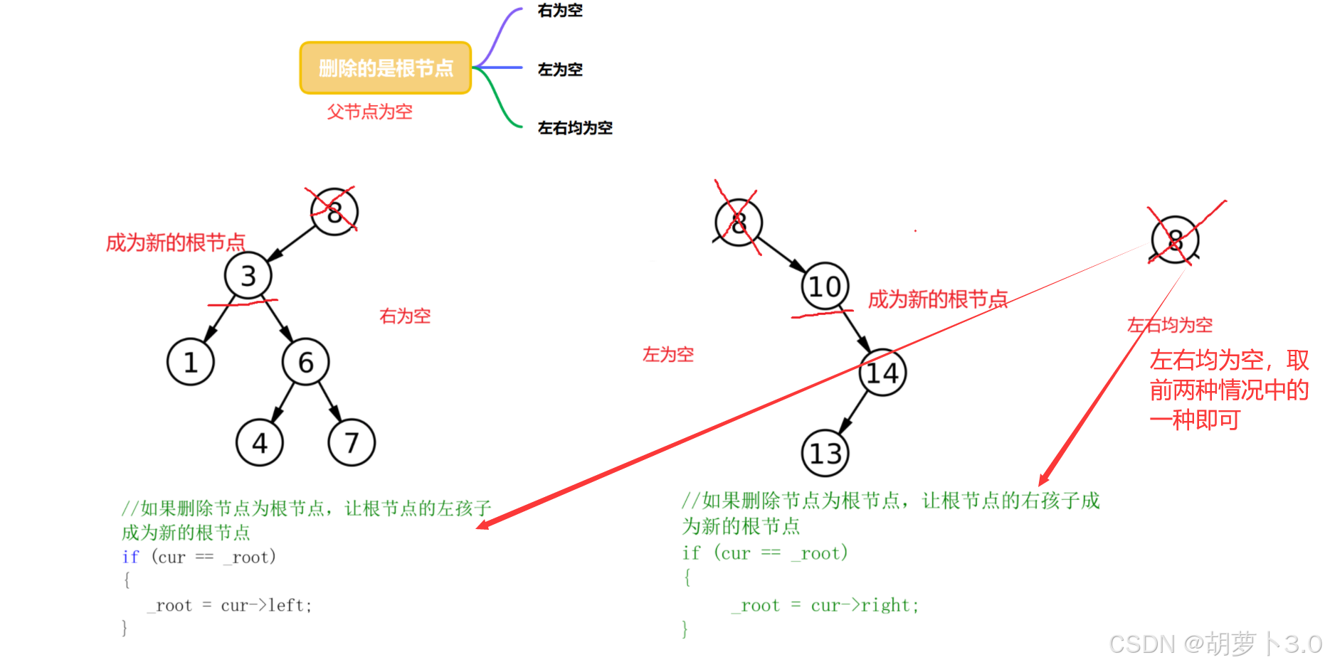 我们要让根的左孩子或者右孩子成为新的根节点!!!
