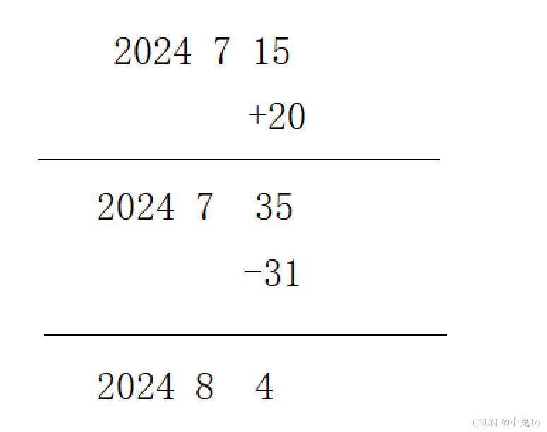 思路:天数先减,如果小于0,节上个月的天数,在加上,月份减一,如果月份为0,年减一,月份置为12。