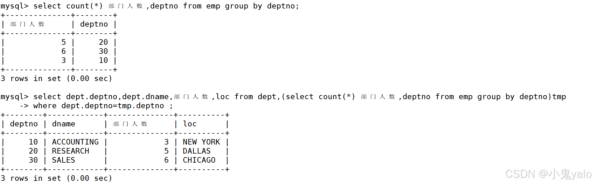 mysql> select dept.deptno,dept.dname,部门人数,loc from dept,(select count(*) 部门人数,deptno from emp group by deptno)tmpundefined -> where dept.deptno=tmp.deptno ;