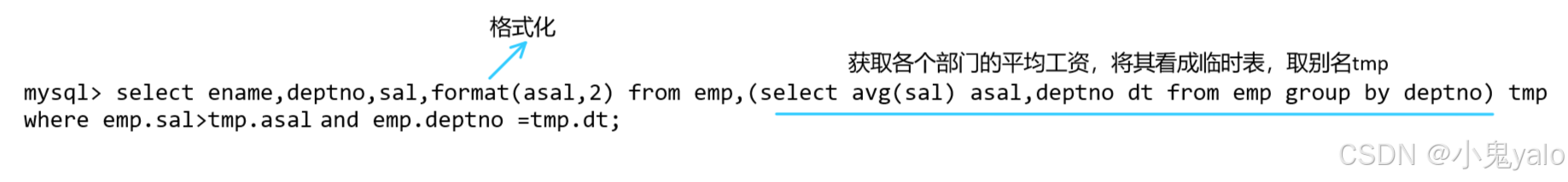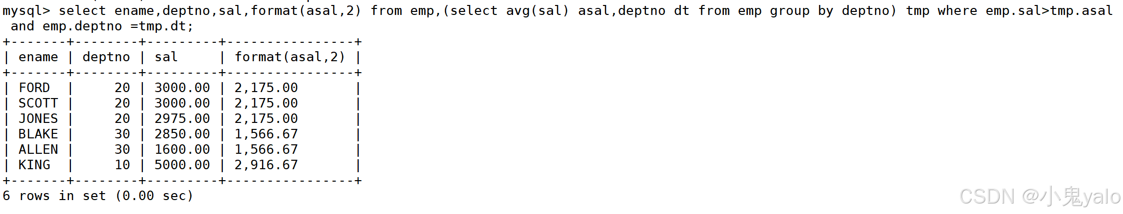 mysql> select ename,deptno,sal,format(asal,2) from emp,(select avg(sal) asal,deptno dt from emp group by deptno) tmp where emp.sal>tmp.asal and emp.deptno =tmp.dt;