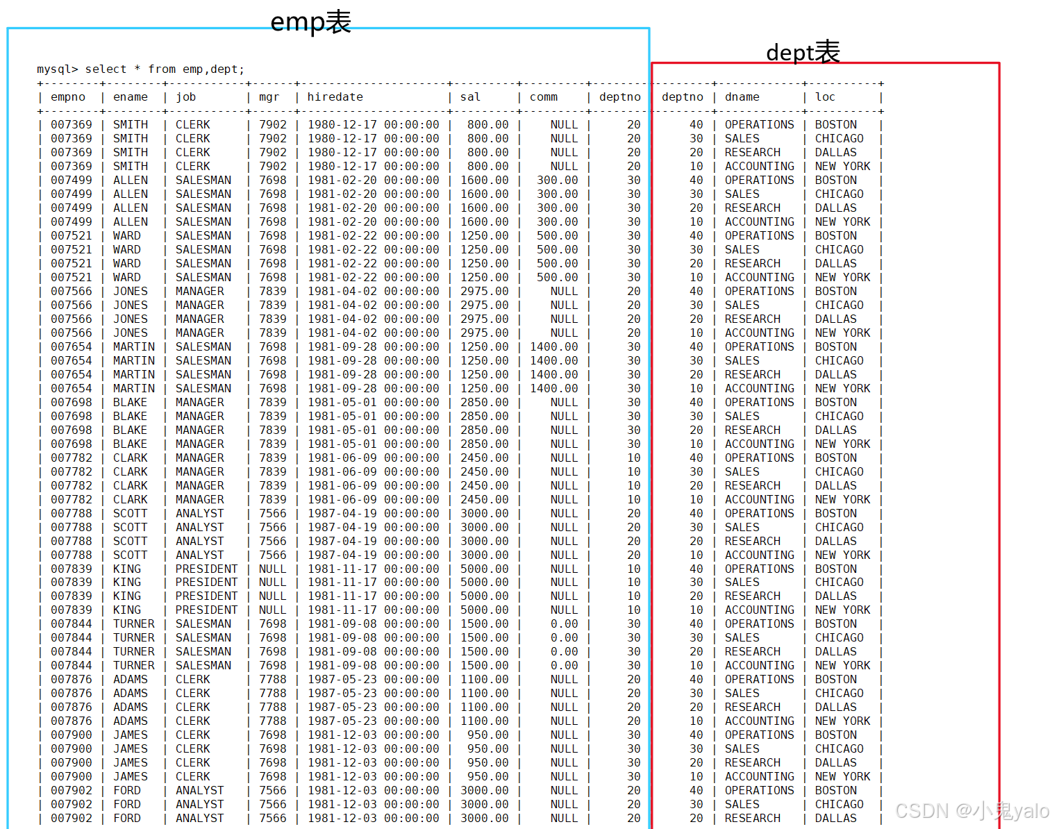 有大量的重复数据,其实我们只需要emp表中的deptno=dept表中的deptno字段的记录。