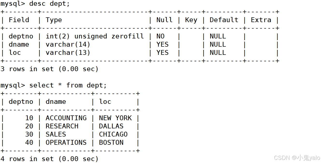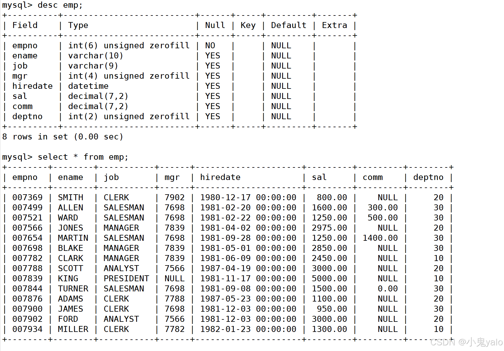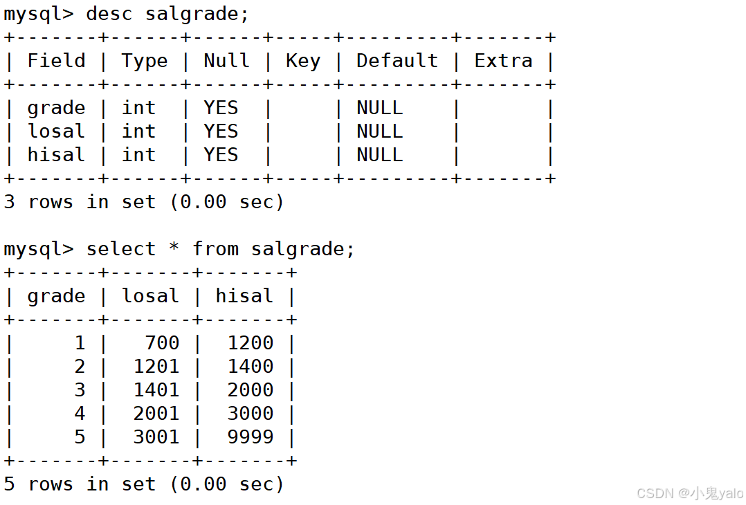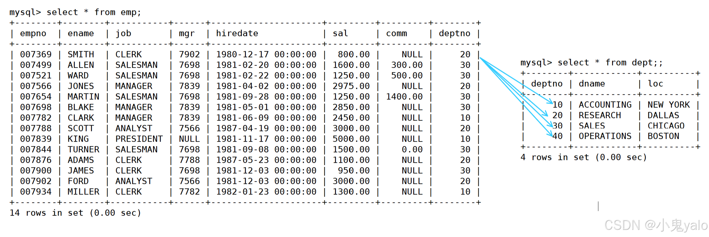 在实际开发中,数据往往来自不同的表,所以需要进行多表查询。在这里用一个简单的公司管理系统,用三张表:emp,dept,salgrade来演示。