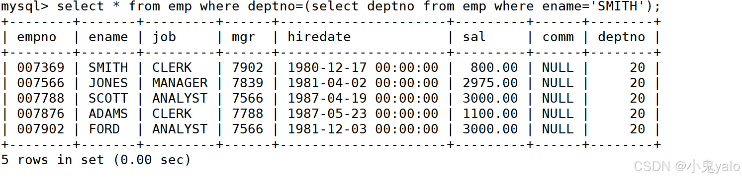 mysql> select * from emp where deptno=(select deptno from emp where ename='SMITH');