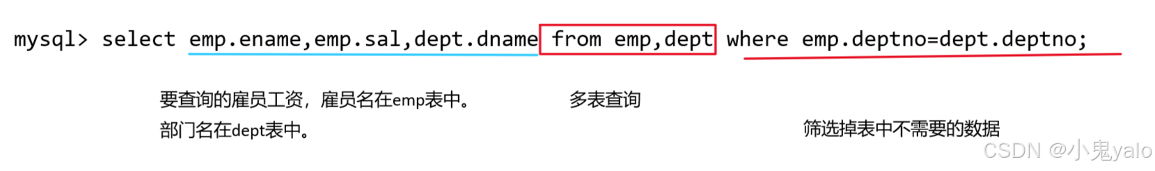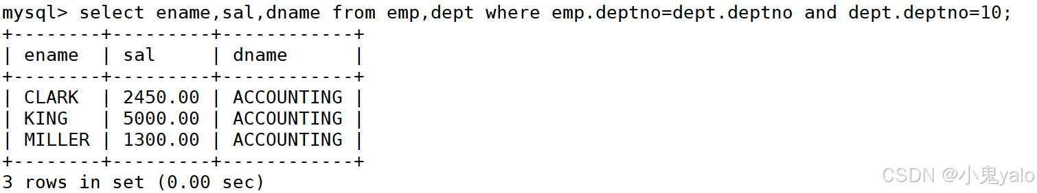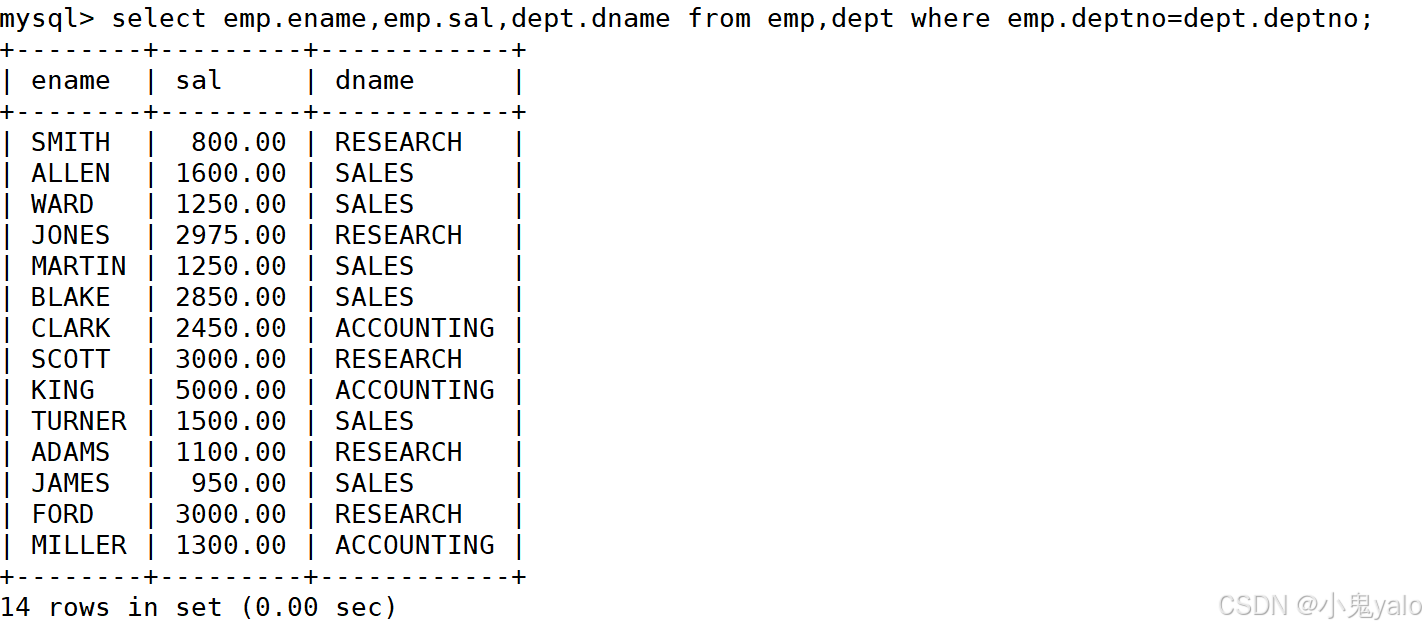 mysql> select emp.ename,emp.sal,dept.dname from emp,dept where emp.deptno=dept.deptno;