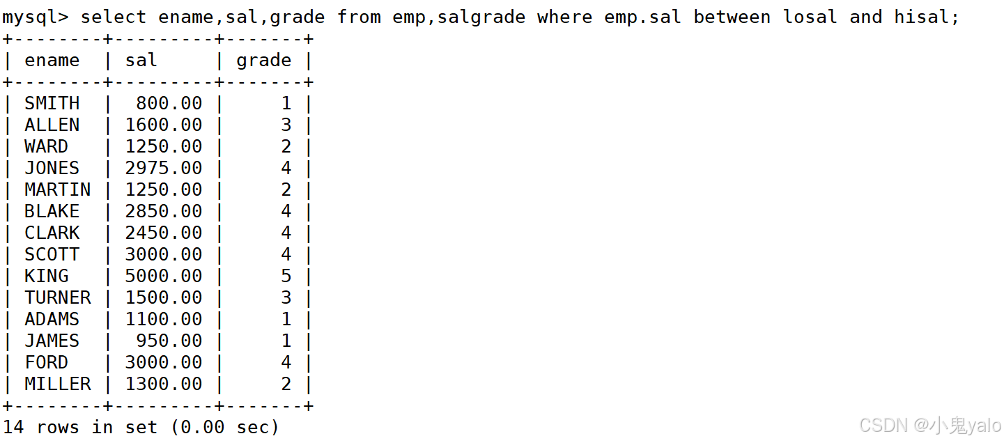 mysql> select ename,sal,grade from emp,salgrade where emp.sal between losal and hisal;//进行笛卡尔积得到的表中,有些员工的工资超出了最低工资和最高工资的范围,是需要舍弃掉的数据