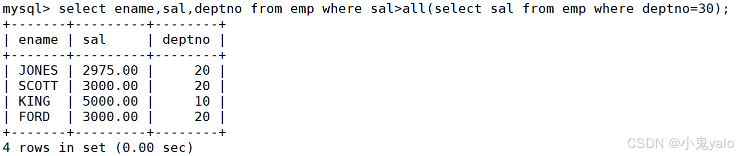 mysql> select ename,sal,deptno from emp where sal>all(select sal from emp where deptno=30);