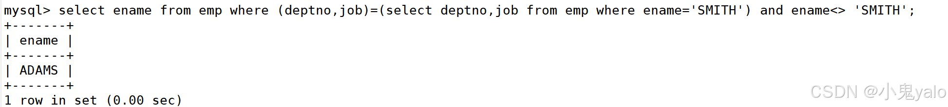 mysql> select ename from emp where (deptno,job)=(select deptno,job from emp where ename='SMITH') and ename<> 'SMITH';