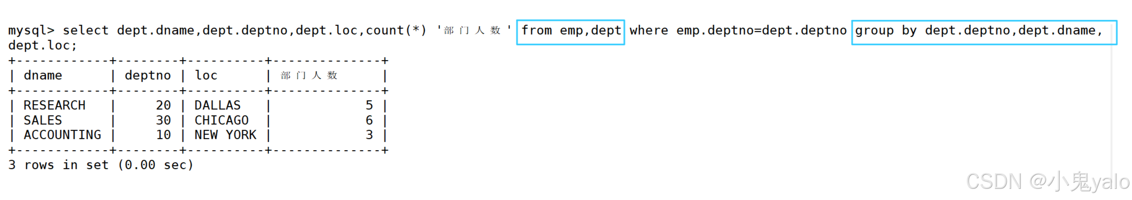 mysql> select dept.dname,dept.deptno,dept.loc,count(*) '部门人数' from emp,dept where emp.deptno=dept.deptno group by dept.deptno,dept.dname,dept.loc;