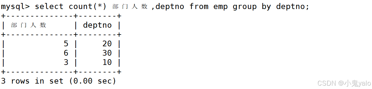 mysql> select count(*) 部门人数,deptno from emp group by deptno;