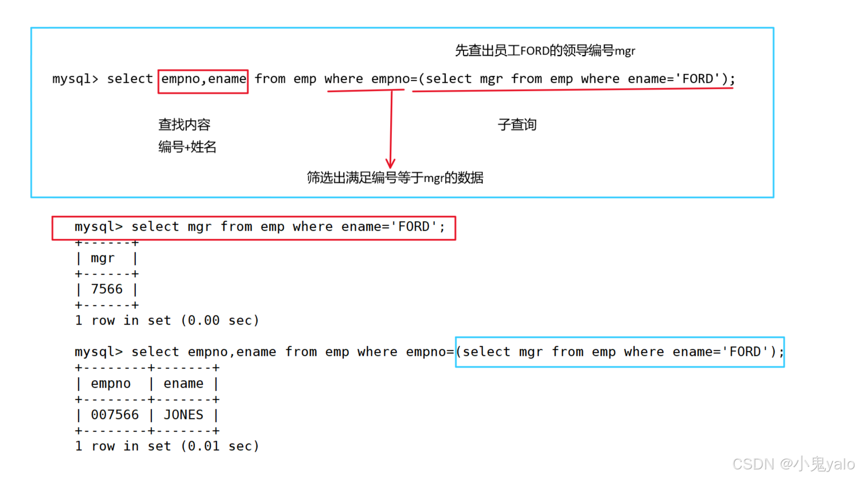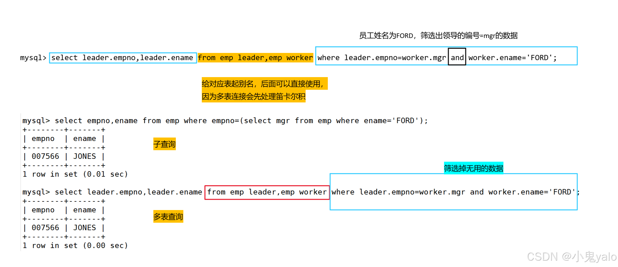 我们想要找的信息在emp表中,先将emp表和自身连接,做笛卡尔积。在结果中,筛选出员工姓名为FORD,FORD的领导编号为mgr。筛选出满足条件的数据:领导的编号=mgr