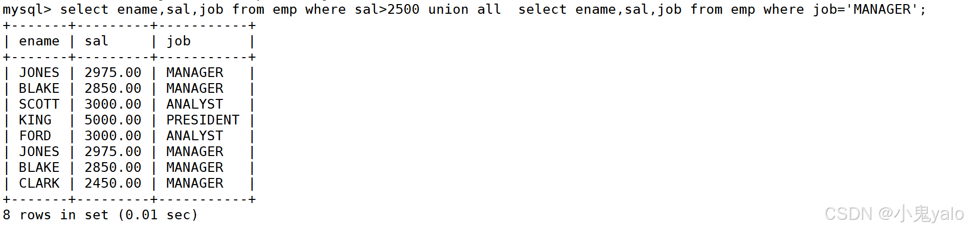mysql> select ename,sal,job from emp where sal>2500 union all select ename,sal,job from emp where job='MANAGER';