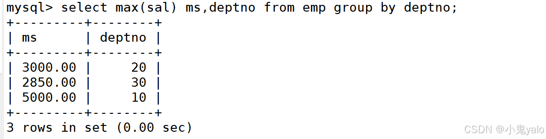 //先查找每个部门的最高工资 mysql> select max(sal) ms,deptno from emp group by deptno;