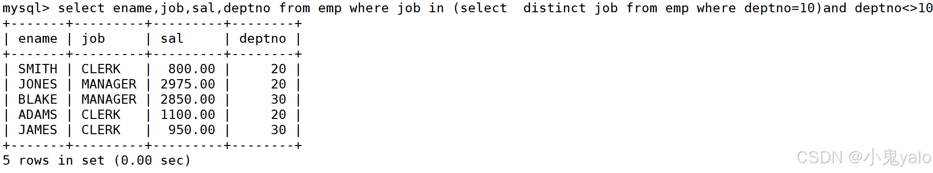 mysql> select ename,job,sal,deptno from emp where job in (select distinct job from emp where deptno=10)and deptno<>10;