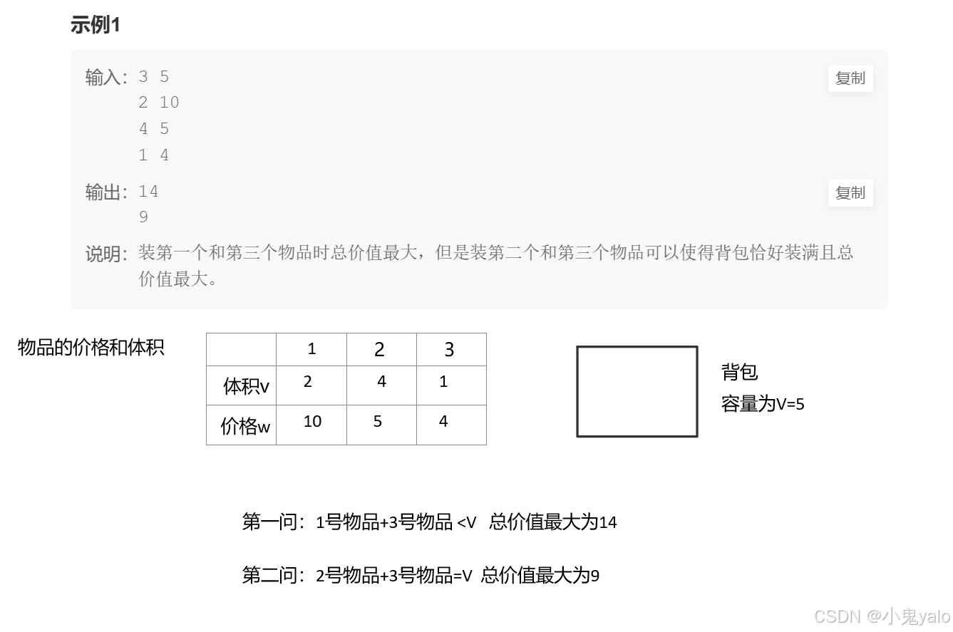 有一个容量为V的背包,还有n个物品。现在忽略物品的实际几何形状,我们认为只要背包的剩余容量大于物体体积,就可以装入该物品。且每个物品只能选一次或者不选。每个物品都有两个属性:体积v和价值w
