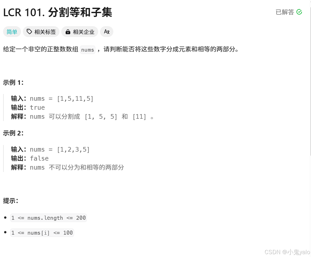 }题目链接:LCR 101. 分割等和子集 - 力扣(LeetCode)