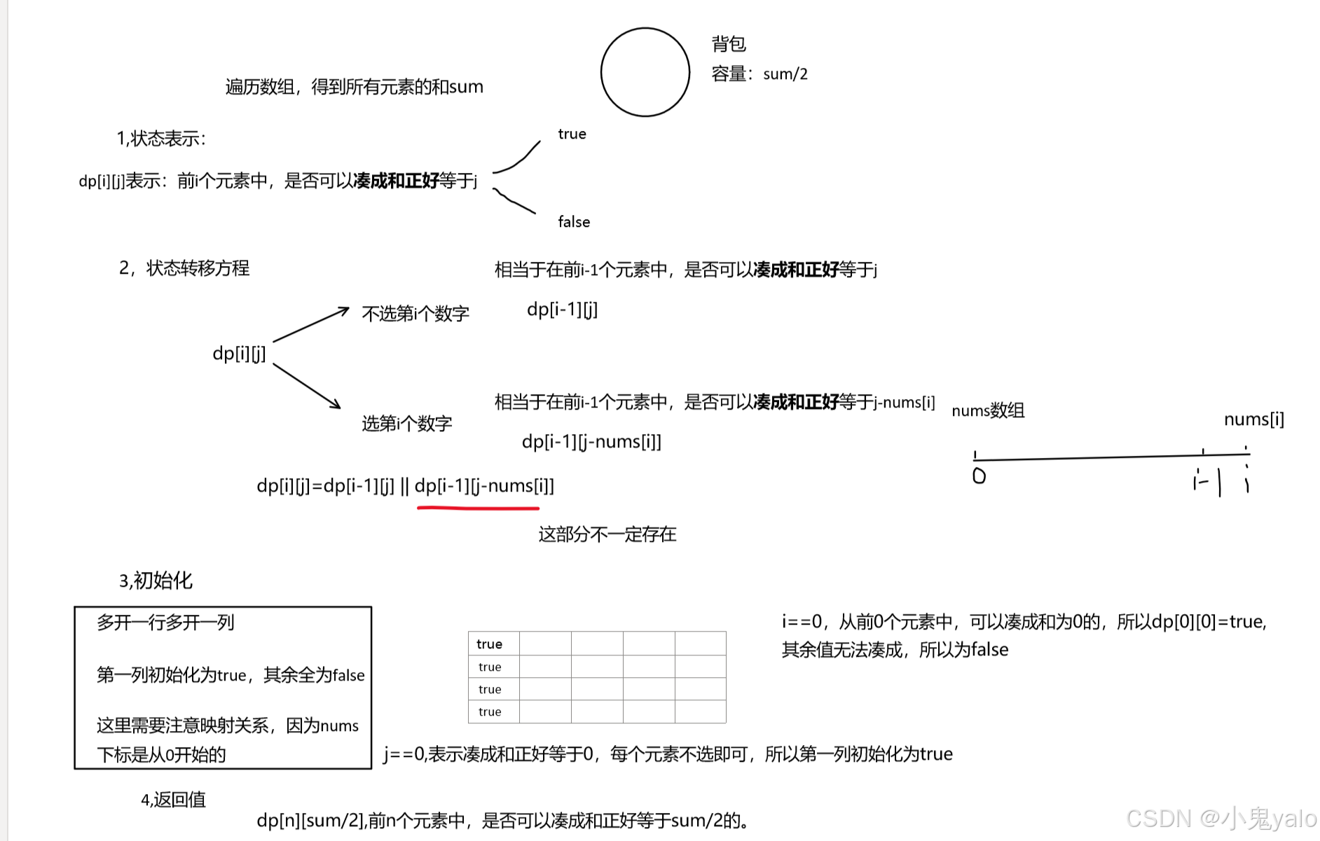 这样我们就把问题转化成了一个数组是否可以凑成sum/2,数组相当于物品,背包容量为sum/2,从数组中选取元素,装入背包。