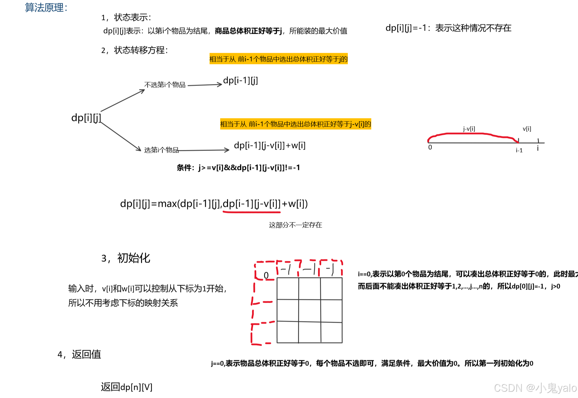 与第一问不同的是,我们想要正好凑成体积等于j的情况可能不存在,我们把这种状态的结果用-1来表示作区分。