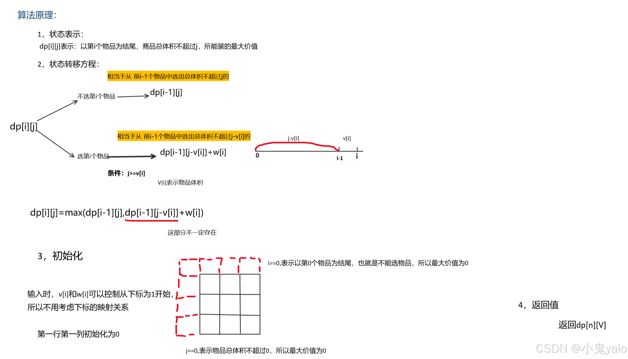 首先,我们容易想到的是将状态表示定义为:dp[i]表示,以第i个商品为结尾,所能装的最大价值。而这样定义,就会面临一个问题,我们在装第i个物品时,不知道背包的剩余容量是否满足物品的体积。所以这个状态表示是不行的,我们可以再加上一个条件: