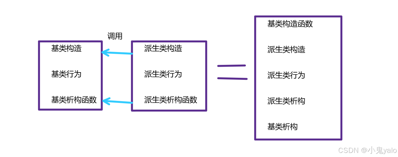 1,派生类的构造函数必须调用基类的构造函数初始化基类的那一部分成员,如果基类没有默认的构造函数,则必须在派生类的初始化列表阶段显示调用。 2,派生类的拷贝构造函数必须调用基类的拷贝构造完成基类部分的拷贝初始化。 3,派生类的operator=必须调用基类的operator=完成基类的赋值,需要注意的是,基类的operator=和派生类的operator=会构成隐藏,所以在显示调用基类的operator=时3,需要指明基类的作用域。 4, 派⽣类的析构函数会在被调⽤完成后⾃动调⽤基类的析构函数清理基类成员。因为这样才能保证派 ⽣类对象先清理派⽣类成员再清理基类成员的顺序。 5.,派⽣类对象初始化先调⽤基类构造再调派⽣类构造。 6.,派⽣类对象析构清理先调⽤派⽣类析构再调基类的析构。