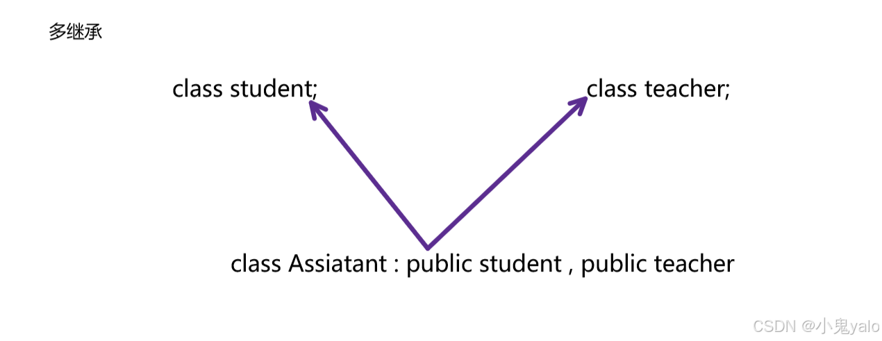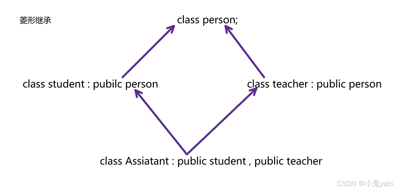 单继承:⼀个派⽣类只有⼀个直接基类时称这个继承关系为单继承。 多继承:⼀个派⽣类有两个或以上直接基类时称这个继承关系为多继承,多继承对象在内存中的模型 是,先继承的基类在前⾯,后⾯继承的基类在后⾯,派⽣类成员在放到最后⾯。 菱形继承:菱形继承是多继承的⼀种特殊情况。菱形继承的问题,从下⾯的对象成员模型构造,可以 看出菱形继承有数据冗余和⼆义性的问题,在Assistant的对象中Person成员会有两份。⽀持多继承就 ⼀定会有菱形继承。